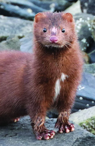 Mink foot and tracks in fine sand. If you disregard the small fifth (inner) toe, mustelid tracks resemble those of dogs. Because this toe often fails to print, tracks should be studied carefully. Remember the palm print is more asymmetrical.