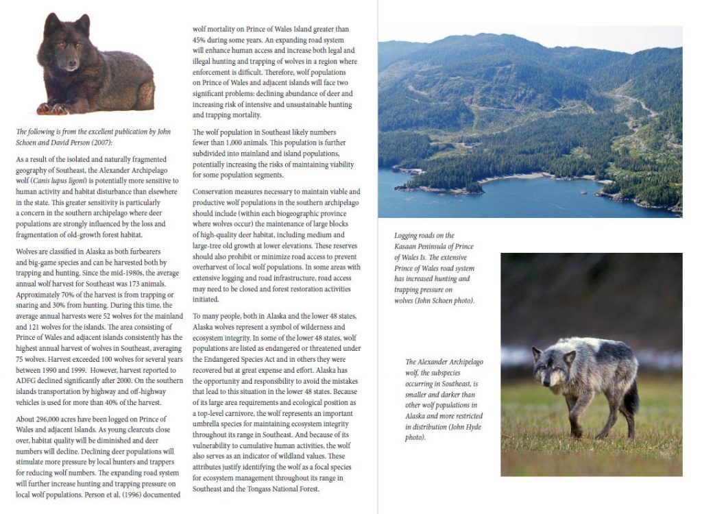 This short piece from the Alaska Wildlife Alliance gives an overview of challenges faced by wolves of Alexander Archipelago by logging, hunting, and human expansion.