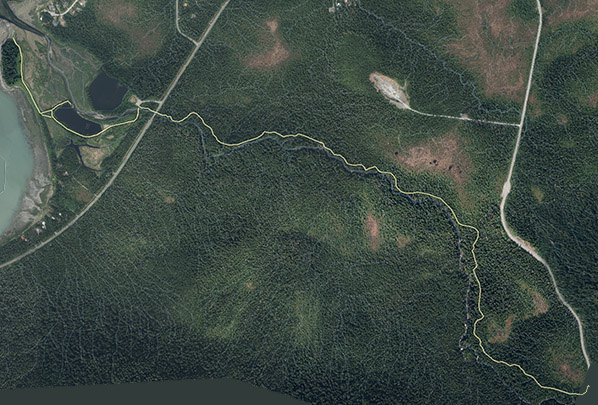 High-resolution GeoPDF pair for field navigation at Angooxa Yé, where slaves put up food (Fish Creek) on northern Sayéik, spirit helper (Douglas Island). Includes the trail up Fish Creek to its eastern trailhead on the road to Eaglecrest. In apps such as Avenza, on your phone or tablet, you can see your GPS/cell-triangulation position on this image, and lay a track.