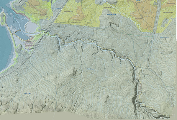 First choice below is a LiDAR-derived bare-earth hillshade with modeled streams and 10-foot contours. Other layers, exported from ArcMap, are named roads, hiking trails, and our wetland units from the CBJ wetland survey project. Thick blue lines are “subsheds,” also mapped during that project. The bold blue line at Extreme High Water butts up against built dikes, showing impediments to tidal cover (that could be removed!). Upper limits of the green tint at 32 feet show maximum tidal incursion at peak Little Ice Age. Moving upstream from North Douglas Highway, the hillshade shows a series of alluvial terraces that formed during receding sea levels as the creek ate downward into its ancient delta.